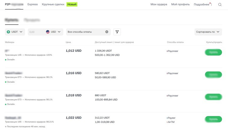 - Откроется P2P-терминал. По умолчанию установлено направление «Купить». Но можно и продать криптоактивы за фиат.