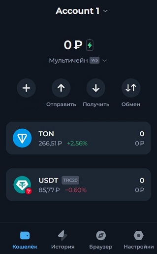 - Хранение Toncoin, токенов Jetton и USDT (TRC-20). Стейблкоин активно используется в DeFi-проектах, поэтому разработчики добавили его в интерфейс.
