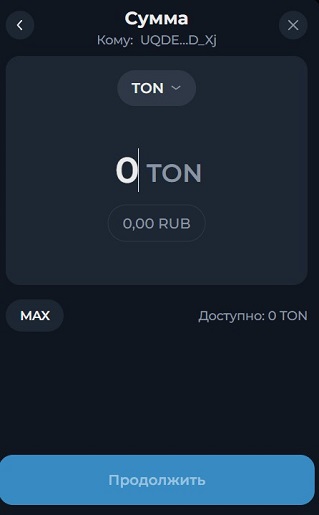 - По умолчанию форма настроена на отправку TON. Нужно кликнуть по тикеру, чтобы выбрать токен. В списке отображаются только активы с положительным балансом.