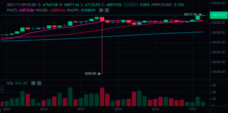 Среди крупных аномалий — уменьшение стоимости BTC на 90% на бирже Binance US в конце октября 2021 года. Цена первой монеты опустилась до отметки $8200, но затем быстро вернулась на $65 000. Кто-то из пользователей поймал удачу за хвост.