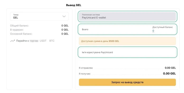 - Убедиться, что на основном счете биржи WhiteBIT есть достаточная сумма в поддерживаемых валютах (евро, грузинский лари или доллар).