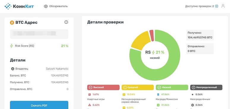 Результат можно скачать в виде PDF-файла. Информация обо всех выполненных проверках также сохранится в личном кабинете. Стоит учитывать, что при переходе на страницу отчета будет использована еще одна проверка, которая покажет актуальное состояние кошелька или транзакции.