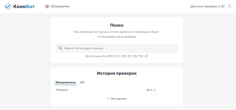 КоинКит предлагает простой и минималистичный интерфейс. После регистрации пользователю доступно 3 бесплатных проверки. Этого достаточно, чтобы протестировать возможности сервиса. Для продолжения работы нужно выбрать тариф — кликнуть по иконке «+» в правом верхнем углу аккаунта.