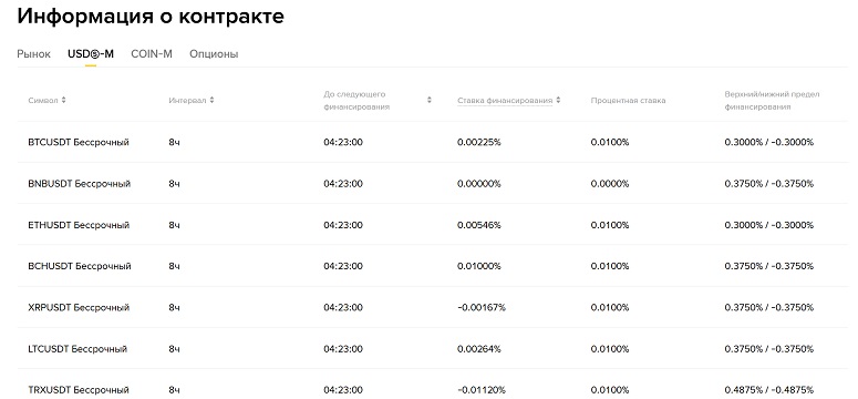 | Interest Rate (ставка финансирования) | Фиксированная, составляет 0,03% в сутки (по 0,01% за каждый восьмичасовой интервал расчетов) для большинства контрактов. По некоторым валютным парам (BNB/USDT) показатель нулевой. |