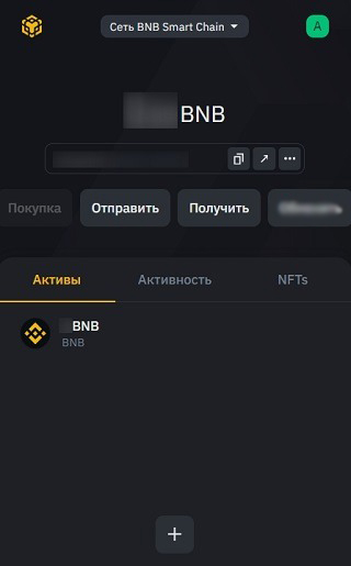 Сверху расположена кнопка для выбора сетей. По умолчанию установлена BNB Smart Chain Network. Если нажать на название блокчейна, раскроется список с другими платформами. В центре интерфейса отображаются баланс кошелька и адрес. Кнопки имеют следующие функции: