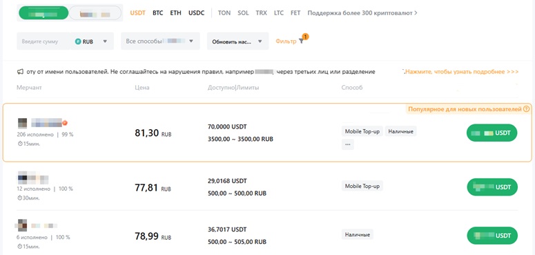 - Откроется главная страница P2P-маркетплейса. Для поиска объявлений нужно выбрать фиат (RUB) и криптовалюту (например, USDT, с ним торгуются большинство монет на споте). Далее — отметить в списке желаемые способы оплаты.