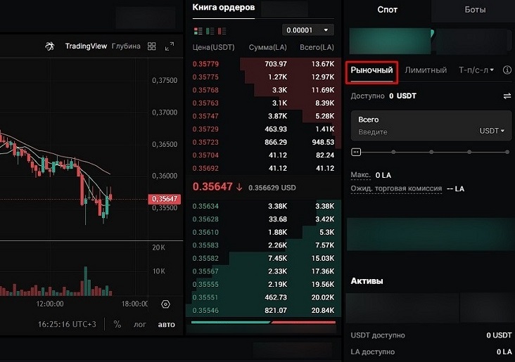 - В правой части графика следует выбрать рыночный ордер, чтобы он был исполнен по текущей цене. Потребуется ввести объем сделки и нажать на «Купить LA».