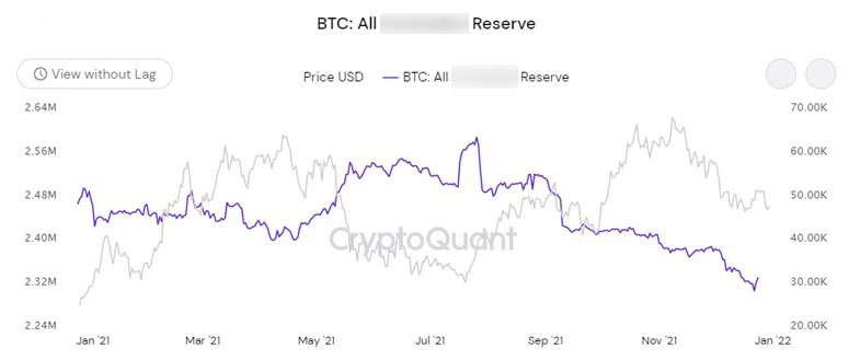 Важно также понимать, что предложение BTC иссякает, когда актив в больших объемах покидает биржи. Создается дефицит и давление спроса. По сути возникает кризис ликвидности. Например, на графике видно, что общий баланс BTC на биржах с июля 2021 года по декабрь 2021 года упал примерно с 2,5 млн до менее 2,3 млн. Этот показатель говорит о дефиците.