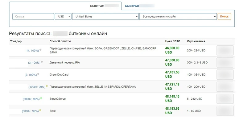 - Основную часть страницы занимает список заявок. В нем есть колонки с именем (ником) продавца, лимитами транзакции, курсом и методами расчетов.