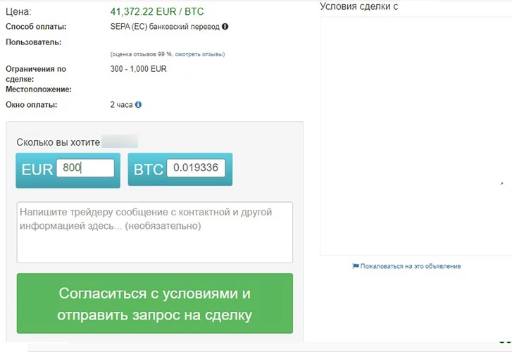 - Изучить условия обмена. На странице каждой заявки есть информация от продавца, а также форма отправки вопроса контрагенту. Если условия обмена устраивают покупателя, он должен указать сумму транзакции и нажать на кнопку «Отправить запрос на сделку».