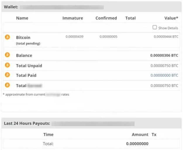 Если все выполнено верно, начнется синхронизация. Через несколько минут можно проверить статус подключения в разделе Wallet на сайте пула.
