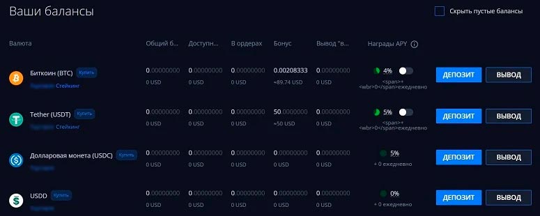 На бирже также предусмотрена награда за первый депозит — 0,002 BTC или эквивалент $100 в других цифровых активах. Эти деньги появятся на бонусном балансе сразу после пополнения счета.