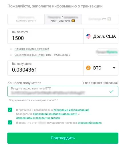 - Покупка криптовалют за фиат через партнерские сервисы Changelly, ChangeNOW.