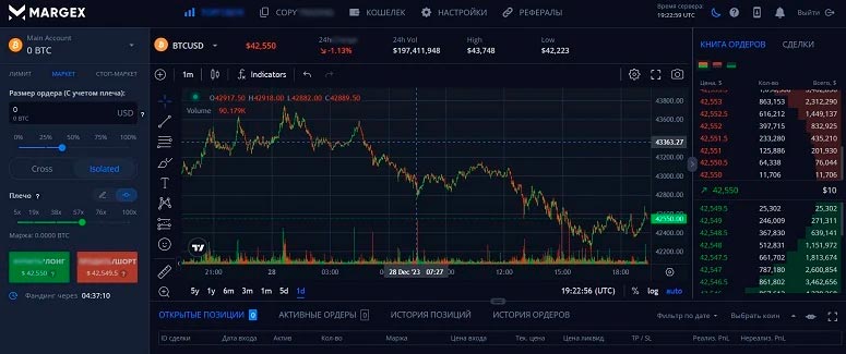 Margex сочетает мощные механизмы для трейдинга и простой интерфейс. В терминале можно отслеживать графики монет, размещать ордера, управлять позициями и отслеживать историю операций.
