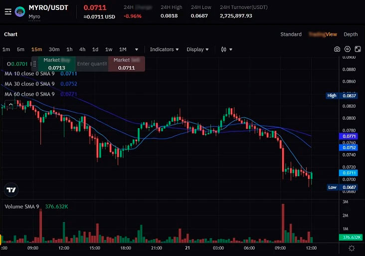 Список платформ для торговли токеном постепенно расширяется. В феврале 2024 года сделки с монетой поддерживают 12 централизованных бирж и 4 DEX. Основная ликвидность формируется на CEX — 87,96%. Большинство бирж торгуют монетой Myro за USDT, на некоторых платформах можно приобрести актив за национальные деньги — USD, KRW, BRL.