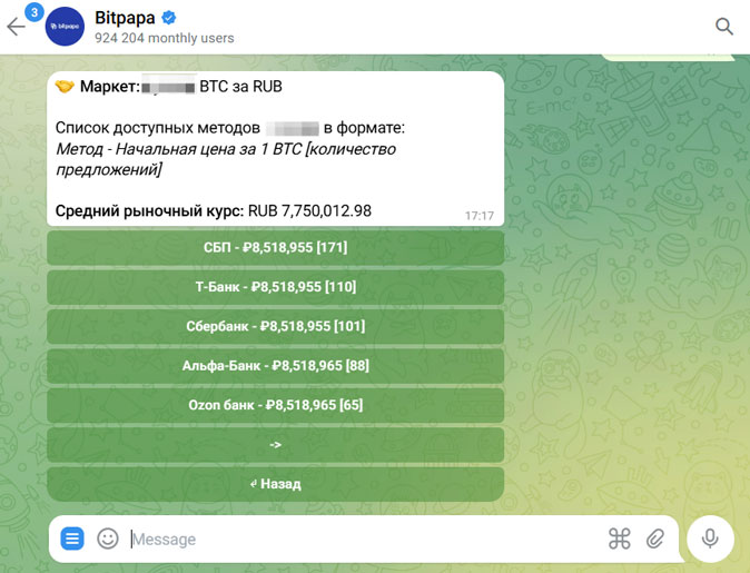 Покупать и продавать криптовалюту можно в мессенджере Telegram с помощью ботов. Многие из них принадлежат известным обменникам и P2P-сервисам, дублируя функционал основных платформ.