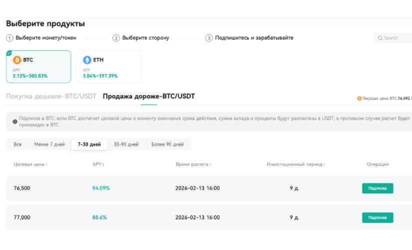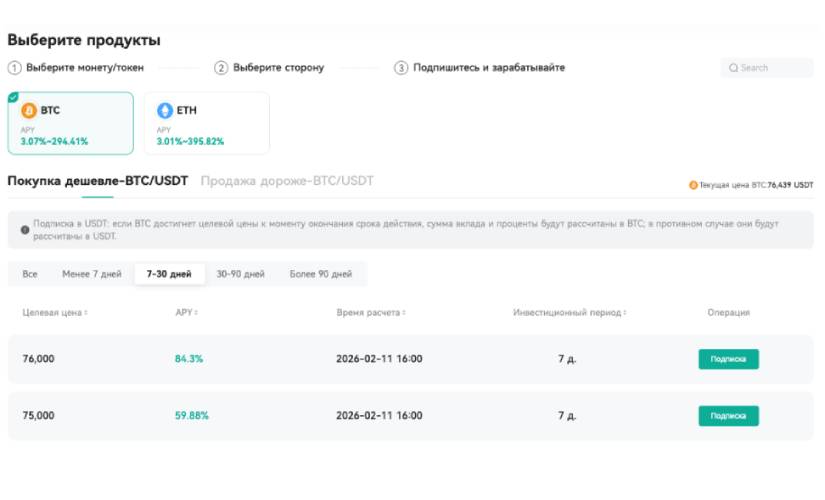 Напротив, стратегия «покупки по низкой цене» имитирует продажу пут-опциона. Она подходит для инвесторов, владеющих определенным количеством USDT, поскольку позволяет им продавать контракты по цене исполнения ниже текущего рыночного уровня. К примеру, при стоимости BTC в $78 000 инвестор может выбрать для покупки опцион со сроком истечения в неделю и ценой исполнения $70 000. Это означает, что если цена биткоина не упадет ниже к дедлайну действия опциона, инвестор получит доход от своих инвестиций.