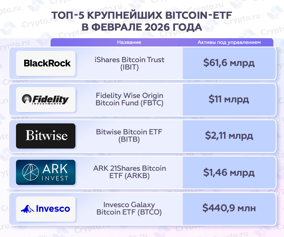 Топ-5 крупнейших Bitcoin-ETF в феврале 2026 года