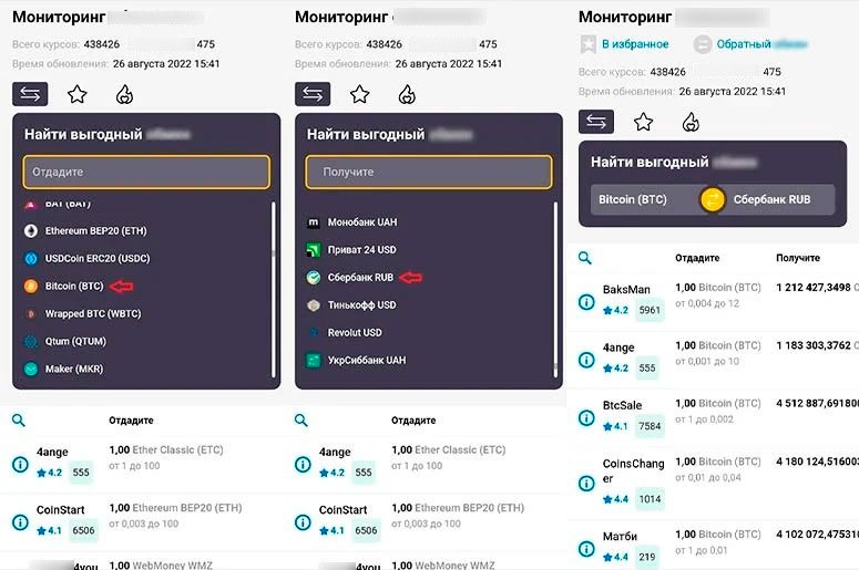 Найти сайт с хорошими условиями можно только при сравнении нескольких сервисов. Для этого стоит использовать агрегаторы. Такие площадки показывают клиентам статистику конвертационных сайтов в формате таблиц. В числе доступных характеристик часто есть курсы биткоина в обменниках.