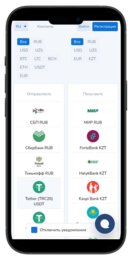 Сервис работает с RUB, USD, EUR, UZS и KZT. Деньги можно переводить и получать на карты Мир, Visa, Mastercard, Uzcard, Humo, СберБанка, Т-Банка, казахских банков, Volet, WebMoney, Paynet. На момент составления обзора обменник работает с наличными RUB, USD, EUR. Через СБП можно приобрести USDT (TRC-20).