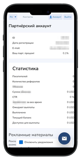 Базовая партнерская ставка составляет 0,1% от оборота приглашенных пользователей. Награды начисляются в USD.