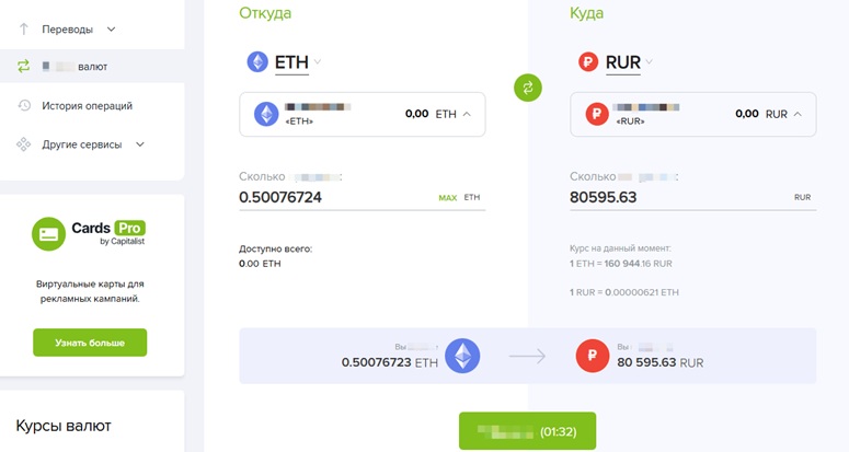 Обмен криптовалюты на фиат выполняется в интерфейсе ЭПС. Инструкция на примере Capitalist: