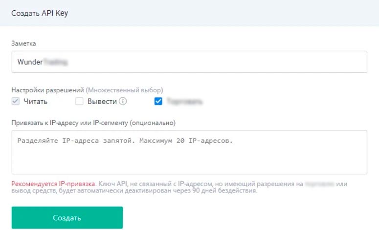 Привязать торговый аккаунт к терминалу WunderTrading можно с помощью API. Для этого нужно авторизоваться на бирже и создать ключ. В настройках API необходимо установить разрешения на просмотр информации и торговлю. Вывод средств должен быть закрыт.