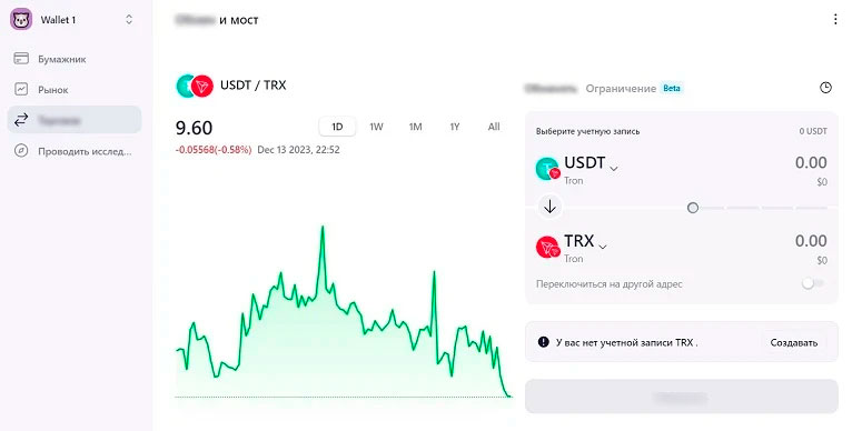 Чтобы выполнить своп, нужно перейти в кошелек и кликнуть по кнопке «Обменять» (или выбрать вкладку «Торговля» в меню слева). После этого откроется форма создания заявки.