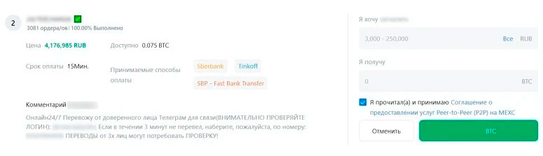 - Контрагент примет заказ и выставит реквизиты для оплаты. Одновременно биржа заблокирует криптовалюту до выполнения обязательств сторонами.