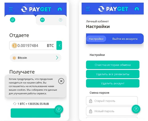 У онлайн-обменника есть мобильное приложение. Программа доступна на смартфонах и планшетах с операционной системой (ОС) Android. Однако гораздо чаще клиенты пользуются Pay Get через браузеры — Firefox, Opera и другие. Интерфейс сайта удобен — подстраивается под разрешение любого экрана и монитора. Поэтому использовать криптообменник можно на десктопных и мобильных устройствах.