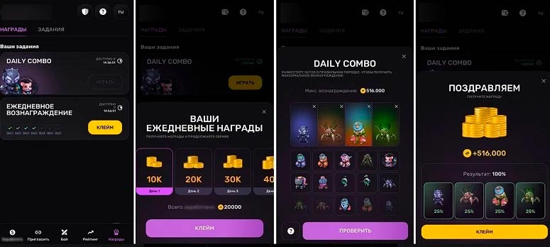 Первым делом необходимо запустить бота в Telegram и получить бонус. Изначально предусматривается автофарминг токенов. Пользователю достаточно заходить в приложение раз в 8 часов. Следует отметить, что за ежедневный вход в игру участник получает дополнительное вознаграждение. Также можно выполнять простые квесты, что позволит заработать больше баллов.