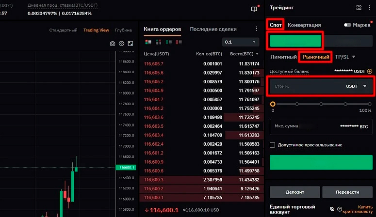 - Справа появится панель, в ней необходимо выбрать «Спот», «Купить» и тип ордера.