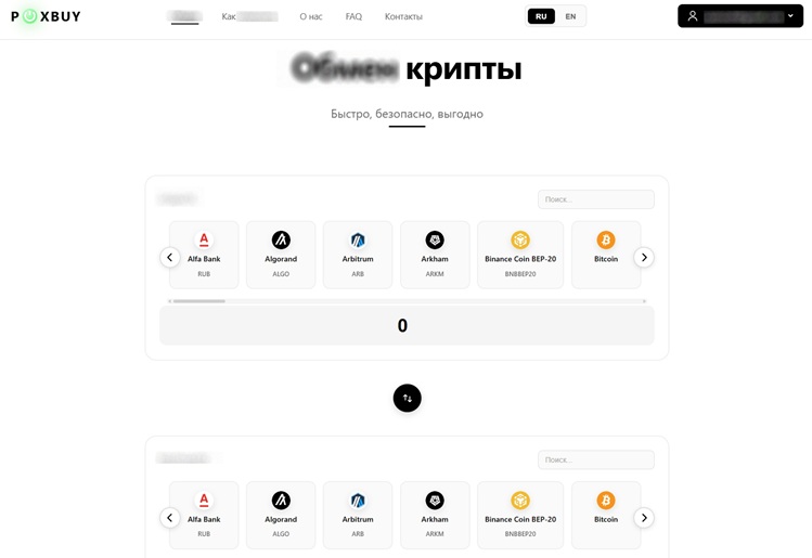 Сайт обменника доступен на двух языках — русском и английском. Переключатель расположен на навигационной панели в верхней части страницы. На ней также находятся кнопки основных разделов сайта: подробное руководство по обмену и выводу криптовалют, контактные данные, информация о сервисе и FAQ.