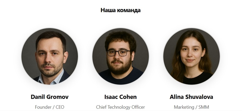 На этой же странице находится информация о команде сервиса. Это нечастая практика среди криптообменников. Команда состоит из трех человек: основателя и гендиректора Данила Громова, технического директора Айзека Коэна и специалиста по маркетингу и SMM Алины Шуваловой. Фотографии и должности каждого из них открыто размещены на сайте, что добавляет сервису прозрачности.