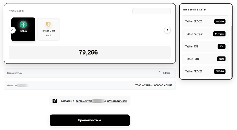 Ниже навигационной панели на главной странице расположены блоки с доступными платежными методами. При их выборе пользователь определяет направление обмена цифровых валют или фиатных активов. Для перехода к форме создания заявки достаточно нажать на кнопку «Продолжить».
