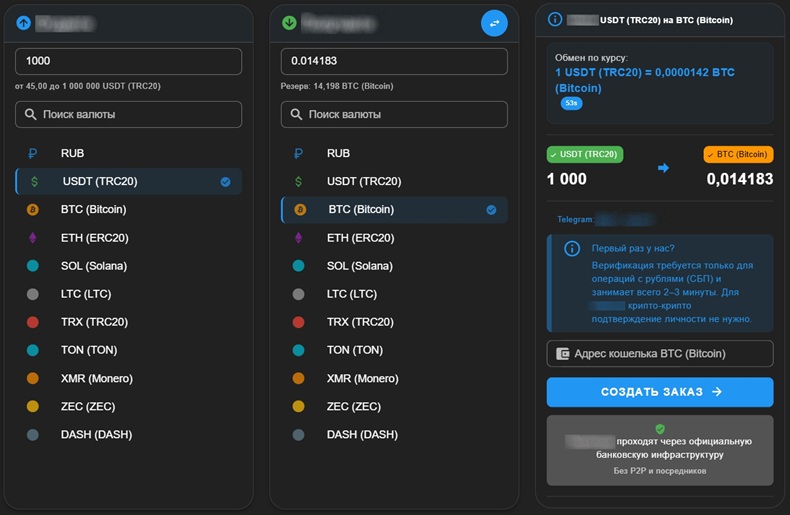 В перечне поддерживаемых криптовалют пользователи найдут биткоин и популярные альткоины: USDT, ETH, SOL, LTC, TRX, TON, ZEC, XMR, DASH. Цифровые монеты можно обменивать не только на рубли, но и конвертировать между собой.