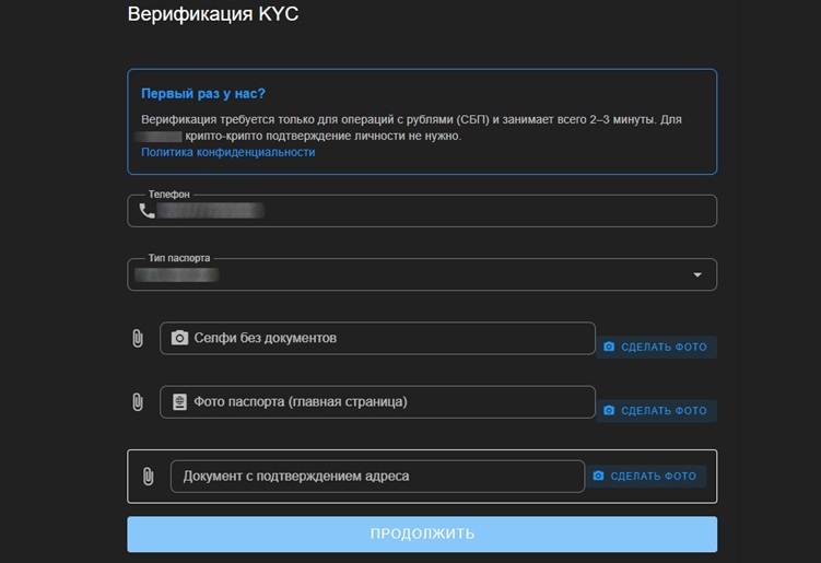После определения валют и ввода сумм в рамках установленных лимитов необходимо заполнить небольшую анкету. Она расположена в правой части страницы. В зависимости от выбранного направления пользователь должен указать определенные данные. Это могут быть ФИО, наименование банка для оплаты, номер телефона, Telegram, адрес кошелька и т.д.