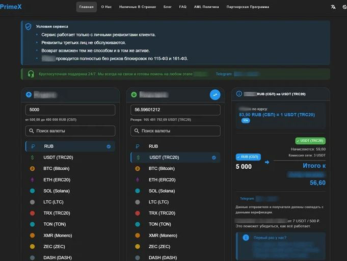 Интерфейс официального сайта обменника Px1 оформлен в минималистичном стиле. При входе на главную страницу пользователи сразу видят небольшой список общих условий сервиса и сообщение о доступности круглосуточной техподдержки со ссылкой на чат в Telegram.