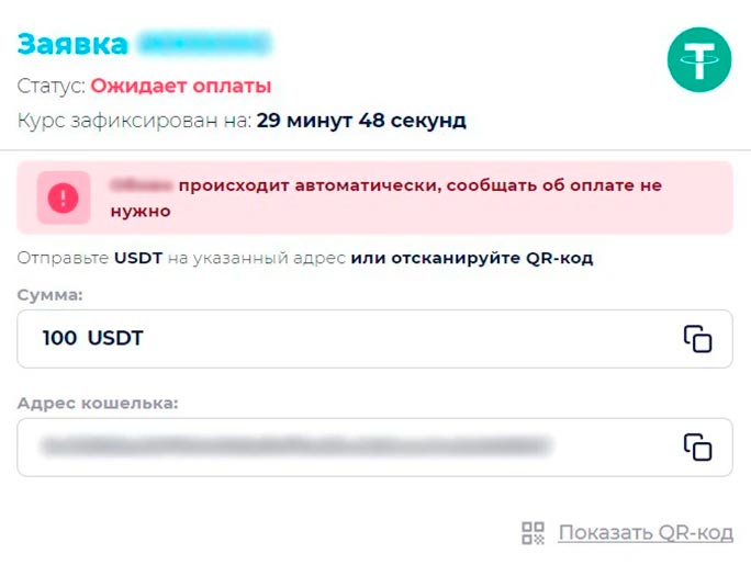 - Перевести USDT на полученный цифровой адрес. Также можно нажать «Показать QR-код», чтобы выполнить быстрый криптовалютный платеж.
