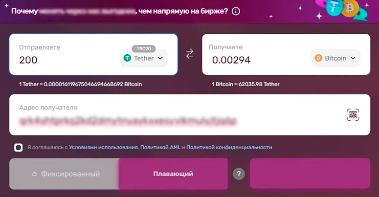 Удобный обменник с хорошими условиями. Проводил обмен BTC на рубли, деньги пришли на карту за пару минут. Радует простота использования.