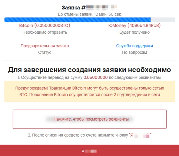 - В окне заявки необходимо открыть реквизиты и сделать по ним перевод. На это дается 15 минут.