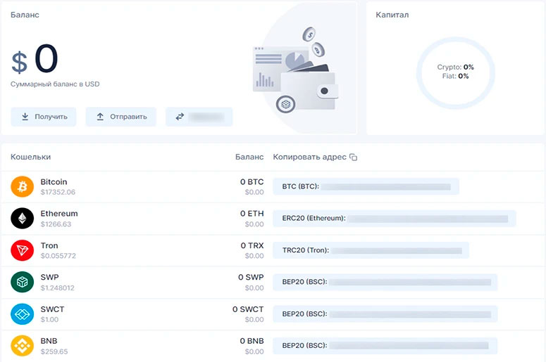| Вывод | 0,0005 BTC, 0,002 ETH, 1 TRX, 0,75 SWP, 1 SWCT, 0,0005 BNB, 0,8 USDT |