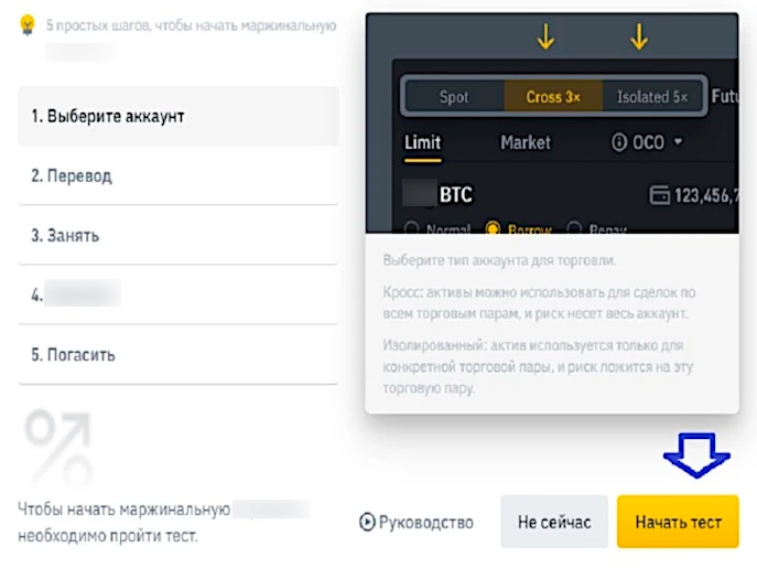 - Перейти в раздел «Маржинальная торговля», или Margin trade. На некоторых биржах для получения кредитного плеча необходимо пройти тест. Это позволяет убедиться в том, что начинающий трейдер понимает, как торговать без лишнего риска.