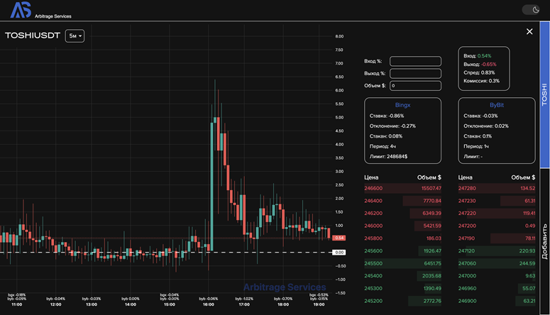 - Arbitrage Services — продвинутые сканеры для межбиржевого и фьючерсного арбитража. Платформа особенно выделяется своим функционалом, большим количеством бирж и сетей. Одним из ключевых преимуществ Arbitrage Services являются графики спредов, которые обновляются в реальном времени. Также проект предлагает бесплатное обучение арбитражу на своём YouTube-канале с пошаговыми плейлистами по всем видам арбитража, что делает сервис полезным как для опытных трейдеров, так и для новичков.