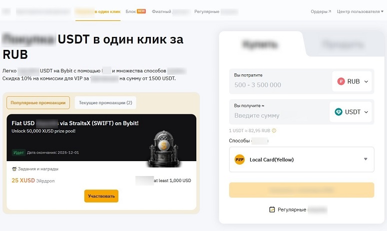 В качестве примера можно рассмотреть процесс покупки на Bybit. В спотовом терминале криптовалюта торгуется в паре с USDT. Для расчета в рублях биржа предлагает использовать сервис быстрой покупки или сразу перейти на P2P-рынок.