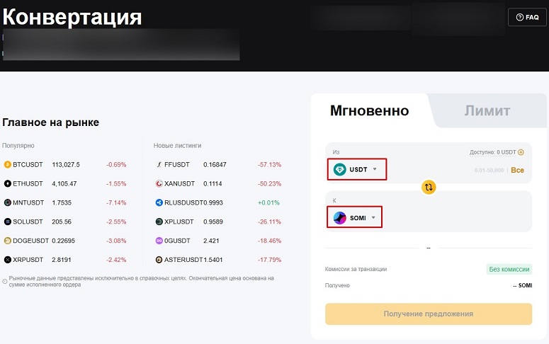 Здесь нужно выбрать мгновенную сделку и задать направление обмена USDT на SOMI. После подтверждения транзакции активы автоматически появятся в аккаунте.