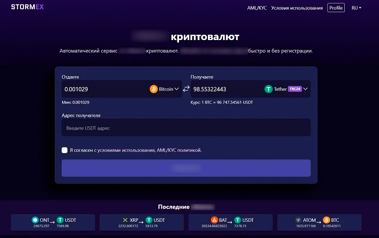 Чтобы приступить к конвертации активов на официальном сайте обменника Stormex, достаточно зайти на главную страницу. На ней расположена форма, в которой указываются 2 цифровые валюты, задействованные в операции: слева — та, которую необходимо отдать, справа — та, которую нужно получить. Ниже требуется ввести адрес для поступления платежа, согласиться с пользовательскими условиями и подтвердить создание заявки кнопкой «Обменять».