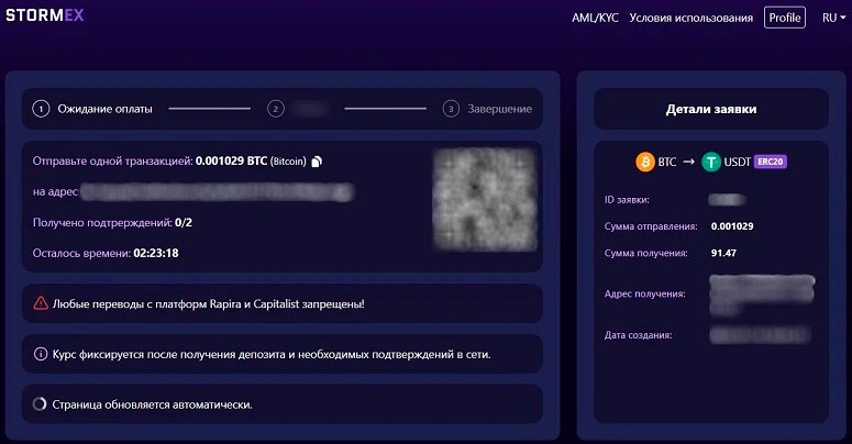 После перевода средств требуется дождаться необходимого количества подтверждений. Например, при обмене биткоина в USDT достаточно двух. После проведения проверки средства будут автоматически отправлены на счет заявителя, а затем сделка завершится.