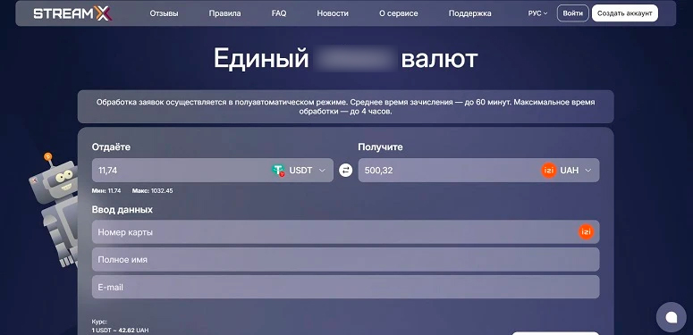 Обменник функционирует на рынке с 2024 года, но уже успел зарекомендовать себя как надежный сервис для работы с криптовалютой. На официальном сайте Streamx Cash доступны сотни направлений, включая операции с фиатными деньгами. Адаптивный интерфейс одинаково удобен для использования на ПК и смартфонах, поддерживает 3 языковые версии — русскую, английскую и украинскую.