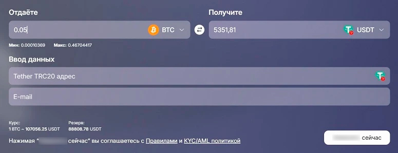 - Перед отправкой заявки нужно ознакомиться с правилами платформы и политикой KYC/AML. Нажимая на кнопку «Обменять сейчас», пользователь автоматически принимает оферту.